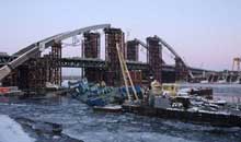 При проведении строительных работ Подольского моста в Киеве огромный плавучий кран Захарий завалился на бок и попал в реку Днепр. Это произошло 18 ноября. Теперь же кран, а точнее - его основной понтон, установлен в горизонтальное положение.