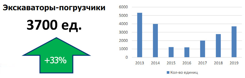 Наибольший прирост произошел в сегменте экскаваторов-погрузчиков. Если в 2018 г. было реализовано 2 778 машин, то в 2019 г. — уже 3 700. Положительная динамика наблюдалась на протяжении практически всего года, за исключением мая (результат данного месяца — минус 5%).