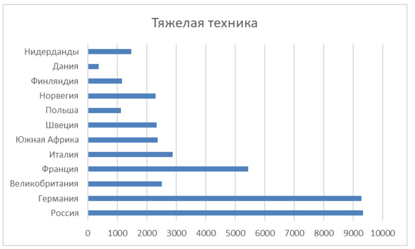 Также специалисты АЕБ сравнили объем рынка России со статистикой других стран. По продажам техники тяжелого класса наше государство лидирует, а вот в сегменте компактной техники мы уступаем многим европейским странам.