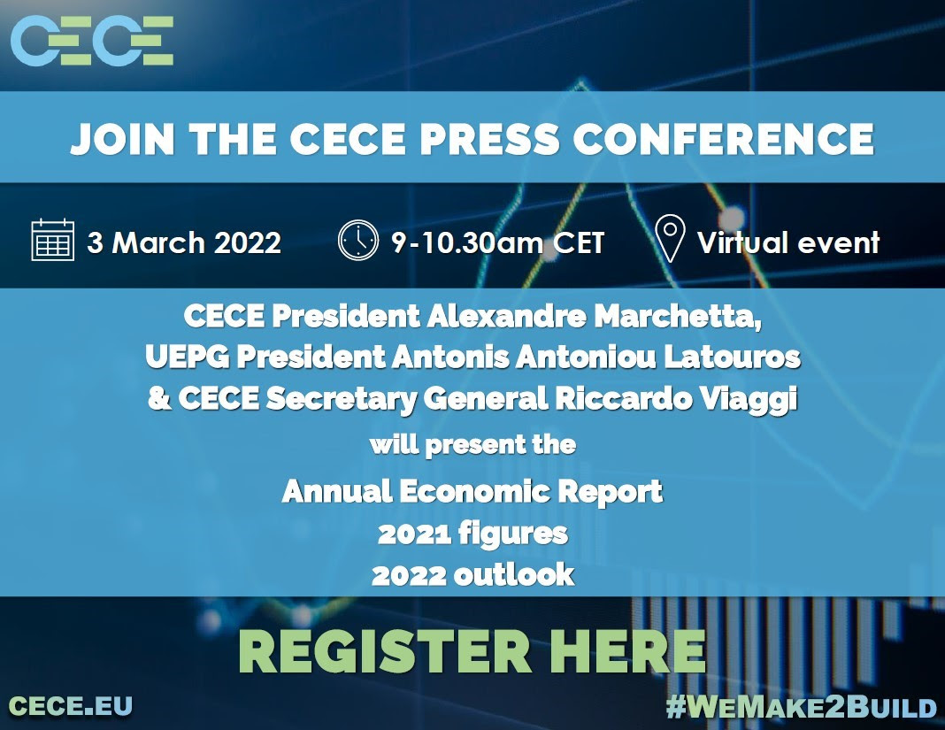 Европейская ассоциация строительного оборудования CECE проведёт 3 марта пресс-конференцию в онлайн-режиме. Темы: экономические итоги прошедшего года, а также прогнозы на 2022 год