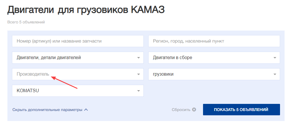 Покупатели могут искать подходящие предложения, указав в блоке фильтров номер (артикул) детали.