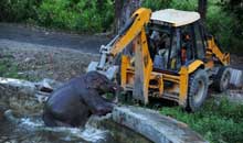 Поначалу, команда ветеринаров пыталась поднять слона с помощью джипа, однако все усилия оказались напрасны. Только с помощью экскаватора-погрузчика JCB без особых усилий удалось поднять замученного слона на ноги : обвязав веревкой тело слона, двое мужчин привязали ее концы к ковшу экскаватора. Плавно поднимая ковш, машина поставила слона на ноги, после чего слон самостоятельно смог передвигаться.