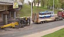 Трейлер, перевозивший автокран, выехал из-под моста на улице Свердлова уже порожним
