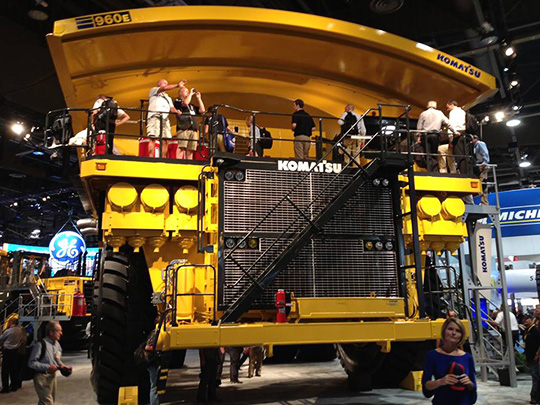На стенде Komatsu America присутствовало сразу несколько типов техники, при разработке которых опирались на два главных критерия - повышение экологичности и снижение затрат на одну перемещаемую тонну. Причем в сегменте карьерных самосвалов было представлено сразу несколько образцов. Первый из них - 980E-4, полезная грузоподъемность которого составляет 362 т (максимальное значение для техники Komatsu). Ранее в этом году данную машину уже успели презентовать в Австралии, сейчас же состоялась ее премьера для широкой публики. "Сердце" новинки - дизель SSDA18V170 мощностью 3 500 л.с. Привод - электрический, выпущен компанией General Electric.