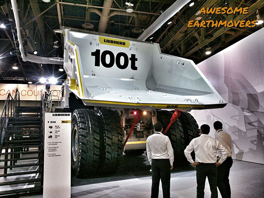 Самым габаритным из самосвалов Liebherr стал T 284. Грузоподъемность данной модели составляет 363 т, мощность двигателя MTU - 4 000 л.с. (возможна установка дизеля меньшей мощности). Трансмиссия - Litronic Plus AC, дизель-электрическая. Машина не является новинкой, но в сравнении с демонстрировавшимся на выставке в 2012 г. экземпляром, машина была дополнена рядом опций.