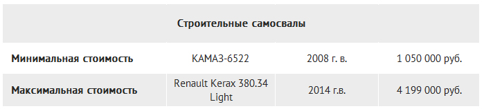 Далее рассмотрим минимальные и максимальные цены на бывшие в эксплуатации строительные самосвалы. Самая низкая цена - чуть более одного миллиона рублей: за указанную сумму продавался отечественный 11-летний КАМАЗ. За 4,2 миллиона можно было приобрести французский Renault Kerax 380.4 Light, которому "исполнилось" всего 5 лет.