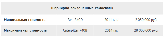 Самая низкая цена, указанная в тексте объявлений, составила 2 050 000 рублей: во столько оценили Bell B40D (-17,9% к показателю прошлого периода). Самым же дорогим экземпляром стал американский Caterpillar 740B, за покупку которого необходимо заплатить без малого 30 миллионов рублей (-21,3%).