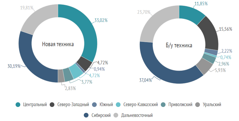 Более 60% объявлений о продаже новых карьерных экскаваторов поступило из двух российских округов — Центрального и Сибирского (33% и 30% соответственно). В сегменте техники, бывшей в эксплуатации, в топ-3 вошли Сибирский (37%), Дальневосточный (23,7%) и Северо-Западный (более 15%) ФО.