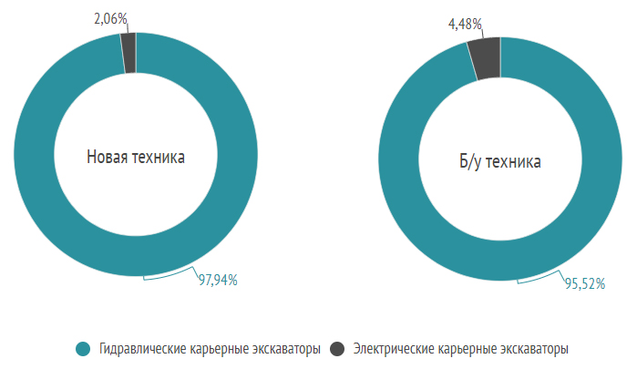Электрические карьерные экскаваторы были представлены в обоих сегментах, хоть и в ограниченном количестве: их доля среди объявлений о продаже новой техники составила 2%, подержанной — порядка 5%.