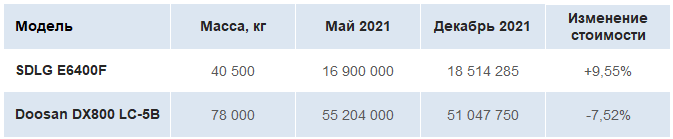 В зависимости от модели, динамика цен показала как рост (+10% на китайский SDLG E6400F), так и падение (-8% на корейский Doosan DX-800 LC-5B).