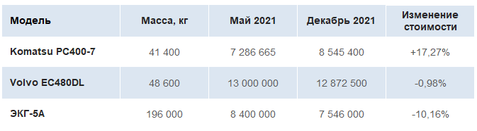 Скачки цен на бывшую в эксплуатации технику были более значительными: +17% к стоимости Komatsu PC400-7 в сравнении с маем 2021 и -10% на ЭКГ-5А. Цена Volvo EC480DL практически не изменилась.