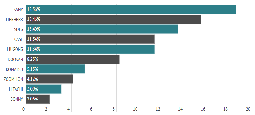 Лидирует в топе китайский производитель Sany. С отставанием в считаные проценты Liebherr занял вторую строчку рейтинга, SDLG — третью.