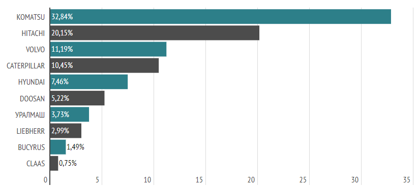 В сегменте подержанной техники разбежка между долями ведущих брендов более существенная. Свыше 50% предложений поступило от владельцев японских экскаваторов: Komatsu (порядка 30%) и Hitachi (более 20%). На долю отечественного Уралмаша приходится менее 4%.
