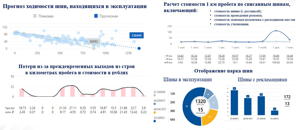 - Постоянный анализ и контроль режимов эксплуатации квалифицированными шинными инженерами: пробег, давление, температура, нагрузка на шину, показатель ТКВЧ, интенсивность износа.