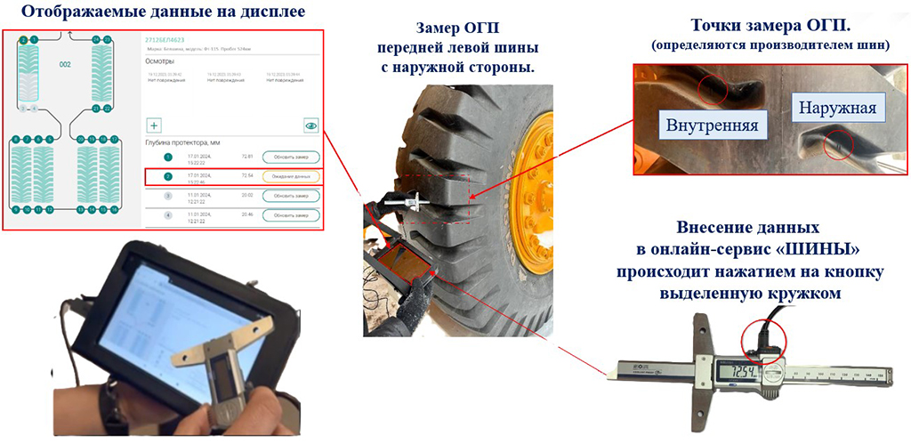 - Проведение аудита парка шин с помощью планшетного компьютера с электронным глубиномером.