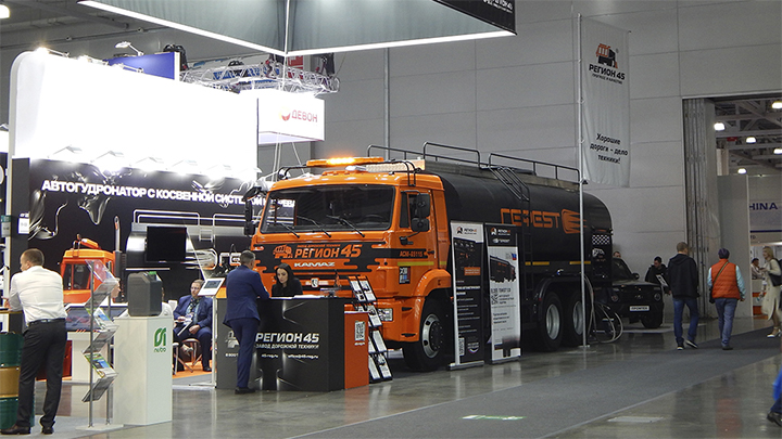 Главным экспонатом завода дорожной техники «Регион 45» стала новая версия масляного автогудронатора с системой косвенного подогрева битумной эмульсии «ГЕФЕSТ 2.0». Среди особенностей обновлённой машины — автоматический раздвижной распределитель битумной эмульсии и система автоматического управления САУ 030 третьего поколения. Система обеспечивает точное дозирование материала, позволяет с планшета задавать параметры распределения битума или эмульсии и в автоматическом режиме выдерживает настройки подачи материала, независимо от скорости движения транспортного средства. Для запуска автогудронатора оператору достаточно нажать одну кнопку.