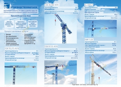 Предлагаем услуги по аренде башенного крана TDK-10.215. Кран в полной комплектности. Организуем перевозку, монтаж, демонтаж. Бригада опытных монтажников и электриков-наладчиков для монтажа и технического обслуживания. Склад запасных частей, что позволяет в минимальные сроки устранять неисправности. Башенный кран имеет следующие характеристики: