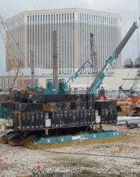 Сваебойная установка LRB 255 производства Liebherr, масса техники – 80000 кг, мощность двигателя – 670 кВт. Эта комбинированная сваебойная и буровая установка LRB 255 разработана для различных сваебойных работ с вибропогружателем и гидравлическим молотом, а также для бурения с двумя буровыми головками, бесконечным буровым шнеком или штангой