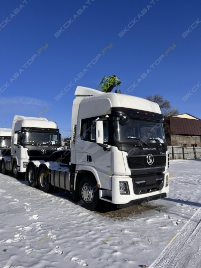Тягач SITRAK C7H 6×4 Характеристики:  Двигатель: MC13.48-50. Мощность: 480 л.с. Трансмиссия: КПП - 12-ти ступенчатая, с гидравлическим замедлителем, с раздаткой. Шасси: передняя подвеска - рессорная; задняя подвеска - пневматическая; передняя балка - VPD71 (дисковые тормоза); задний мост - MCY13 (дисковые тормоза), I=3.7; шины: 315/80R22.5; высота ССУ ~1190-1290 мм, 2 дюйма. Кабина: C7H-G высокая, с двумя спальными местами, с пласиковым бампером, автономный отопитель на 4 кВт, с роскошным пакетом, с холодильником 27 л, 2 проблесковых маячка, с колпаком-обтекателем+направляющей планкой. Топливный бак: 600+400 л. Автоспецмаш 2 года на площадке