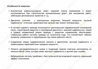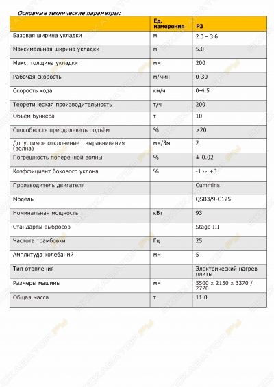 Основные характеристикиШирина укладки 1,2-3,2мМакс. Производительность 250 т/чЭксплуатационная масса 8250 кгМакс. Ширина укладки 3,2 мБазовая ширина раздвижная телескопическая плита от 1,1 до 3,2 мТолщина укладываемого слоя до 18 смРабочая скорость 1,5-30 м/минТранспортная скорость 0-3,6 км/чТранспортные размеры 5300×1760×1970 ммПреодолеваемый уклон ≥20Ёмкость бункера 2,8 м³Нагрев электронагревателямиДвигательДвигатель / тип DEUTZ / TD2.9L4Мощность 55 кВт (75 л.с)Тип питания Дизельный Коррус-Техникс 11 лет на площадке
