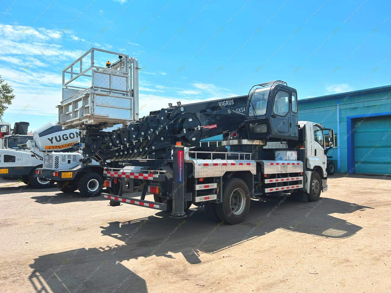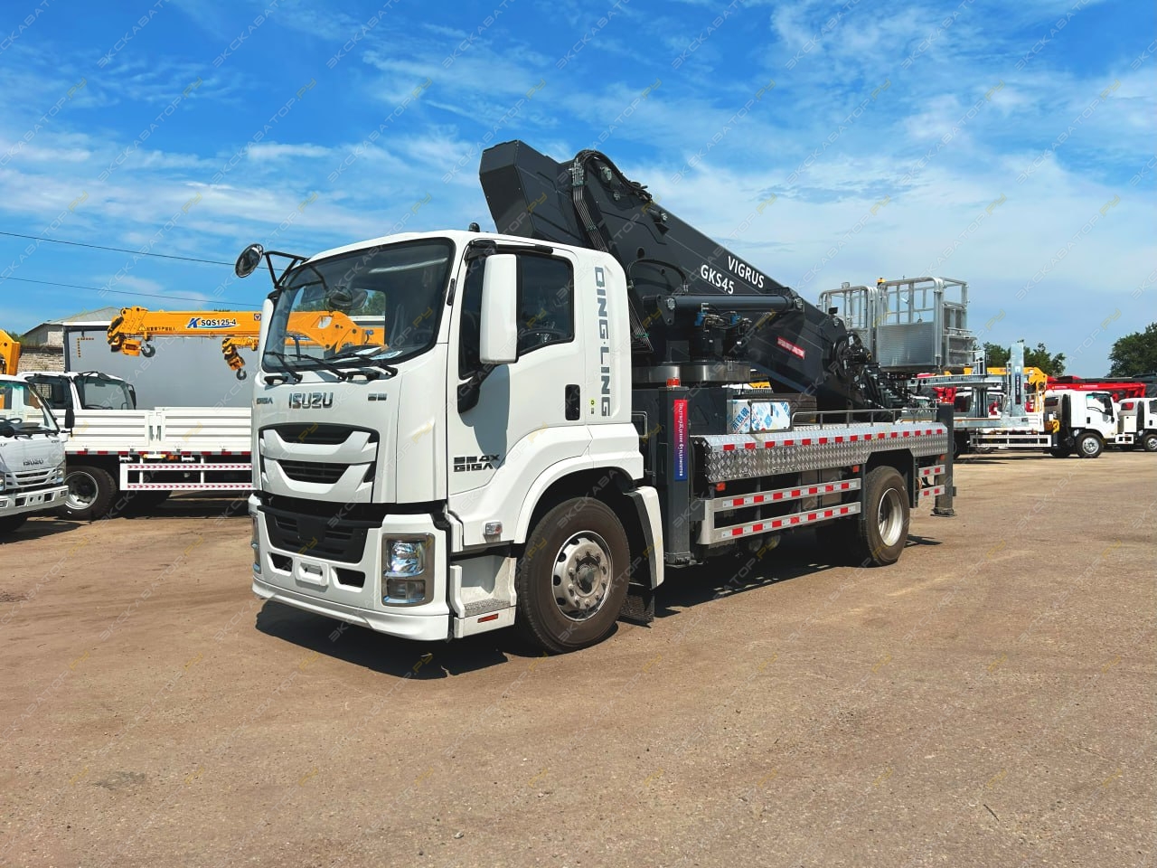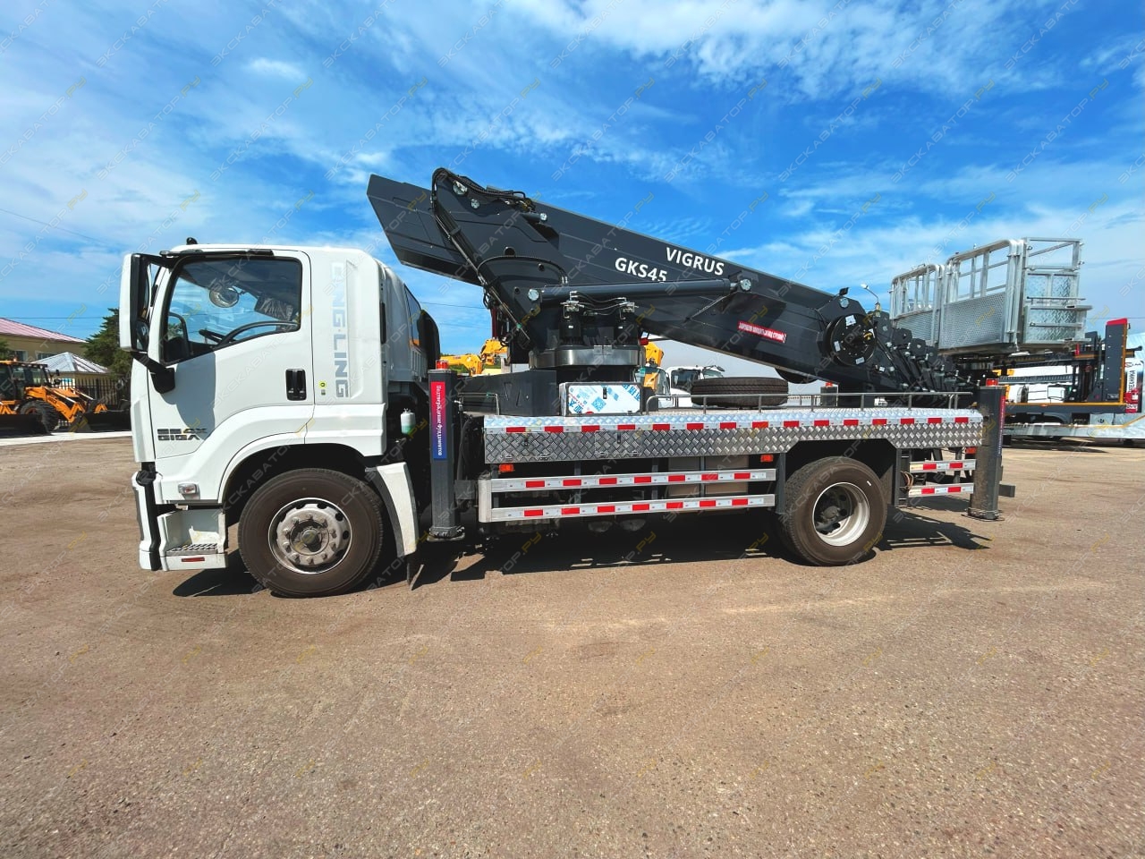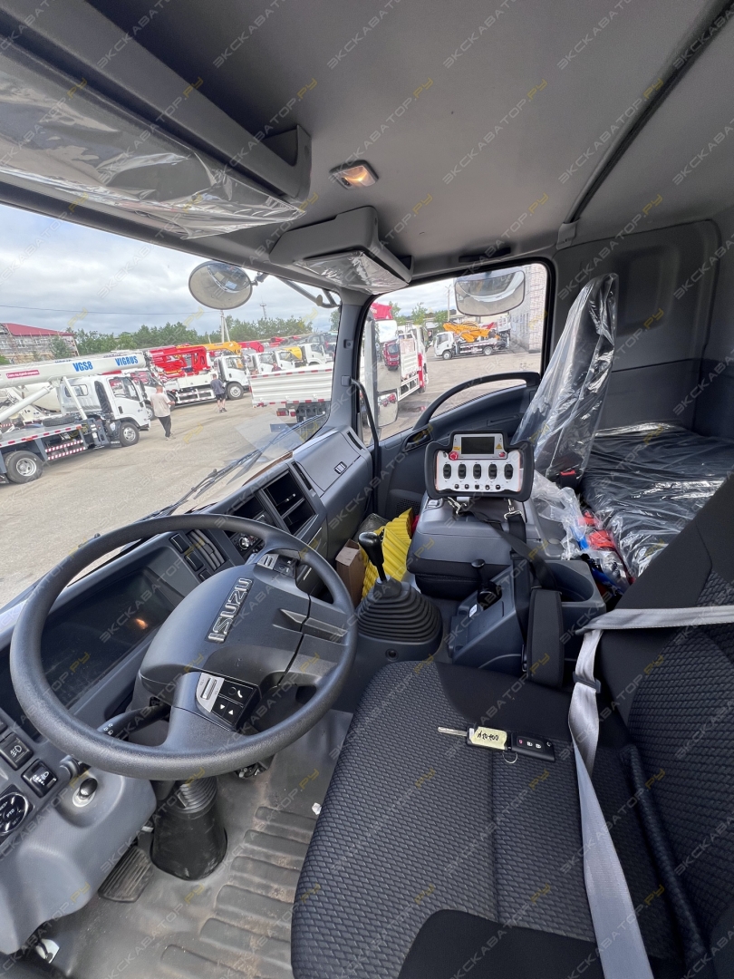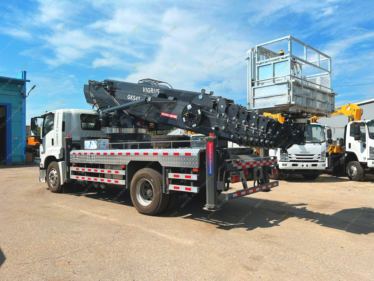 Автовышка на шасси ISUZU 4х2, с двигателем мощностью 151 кВт (205 л.с.), Он оснащён стрелой, которая обеспечивает подъём на высоту до 45 метров.