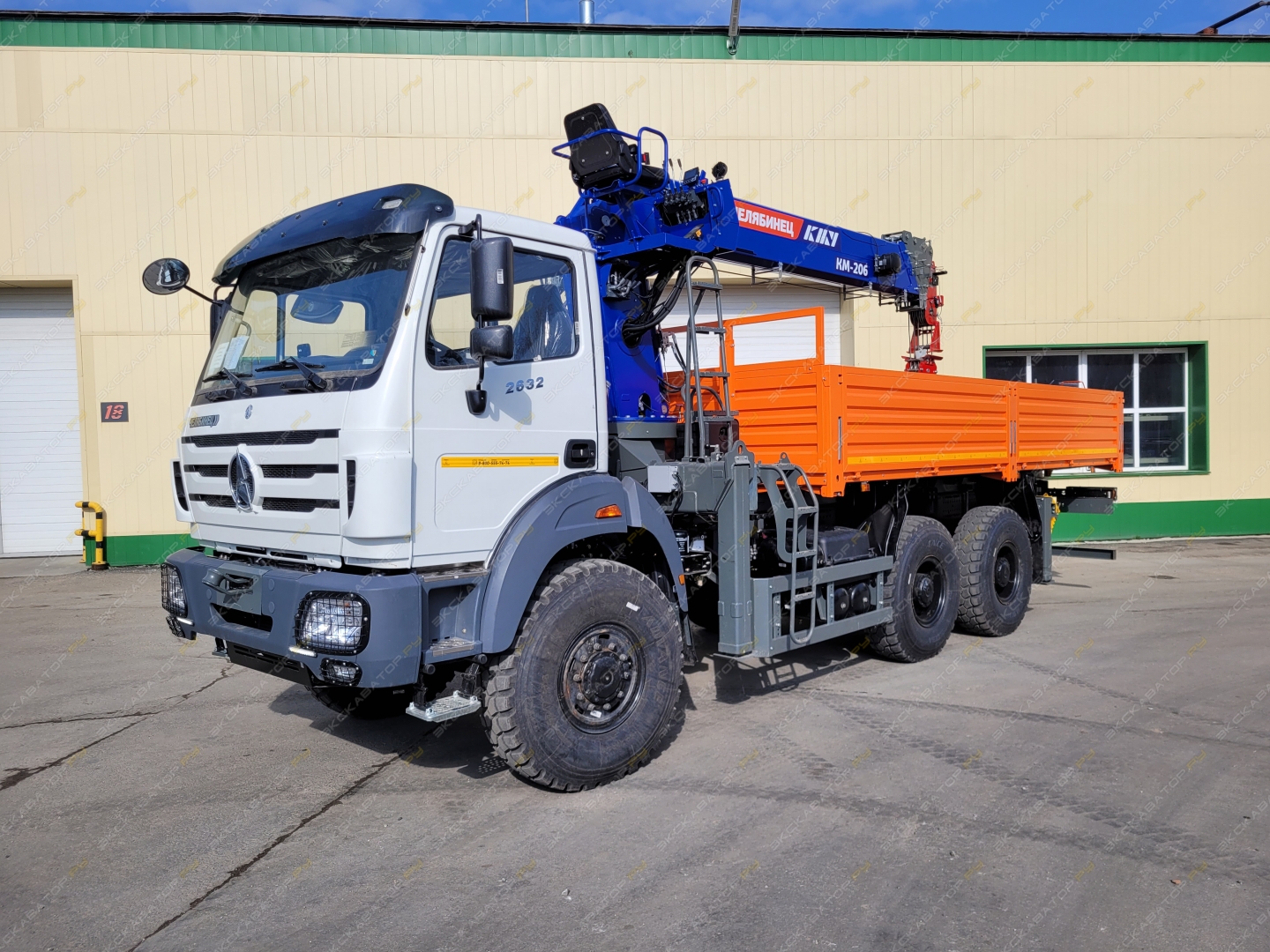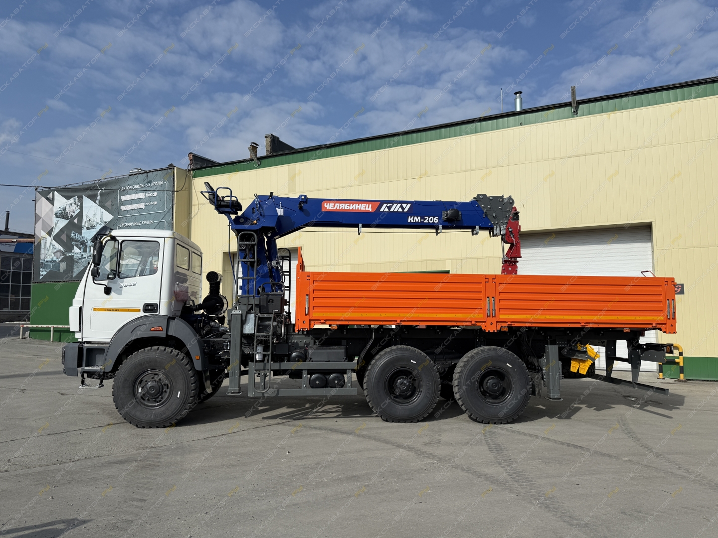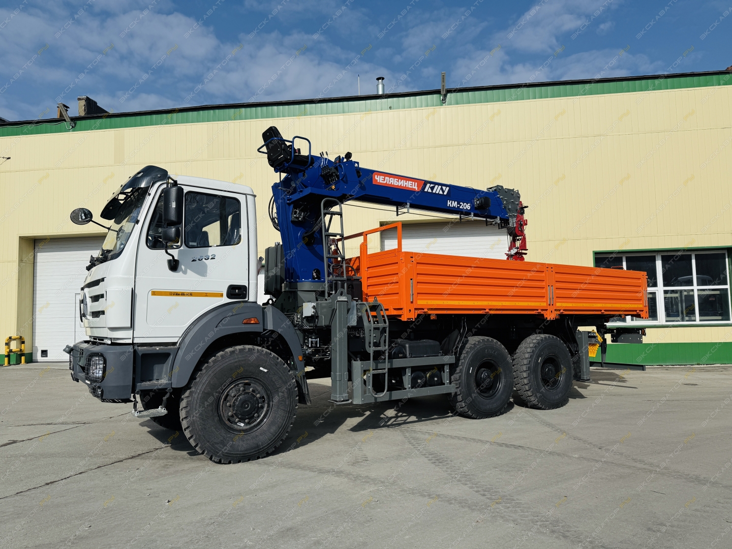 Краноманипуляторная установка ЧЕЛЯБИНЕЦ смонтирована на шасси (6х6) с бортовой платформой грузоподъемностью 11 тонн с металлическими откидными бортами (внутренние размеры 6112 х 2450 х 730 мм.)
