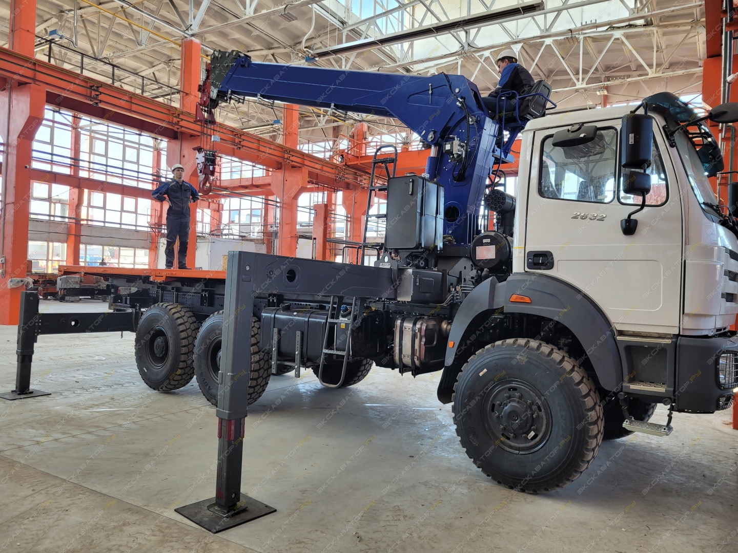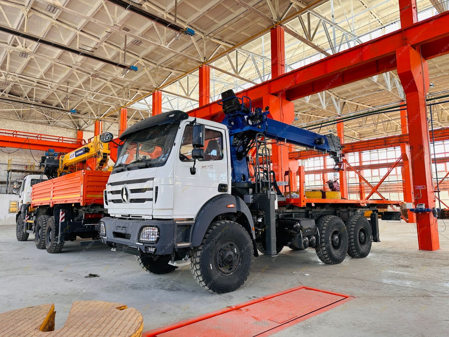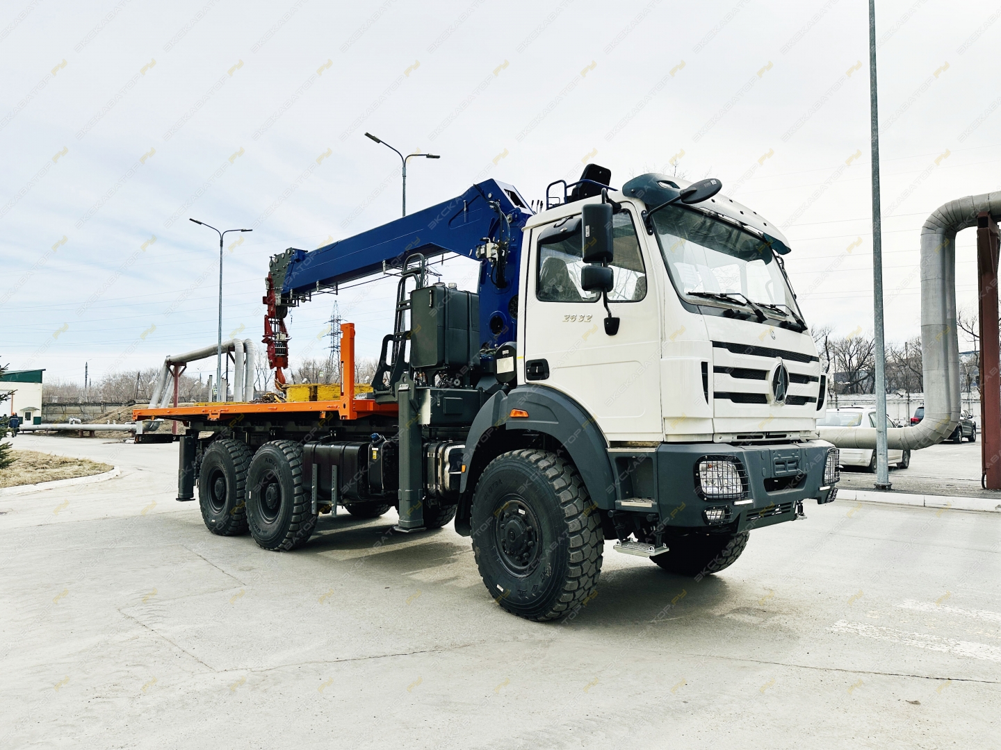 Краноманипуляторная установка ЧЕЛЯБИНЕЦ смонтирована на шасси (6х6) с бортовой платформой грузоподъемностью 11 тонн с металлическими откидными бортами (внутренние размеры 6112 х 2450 х 730 мм.)