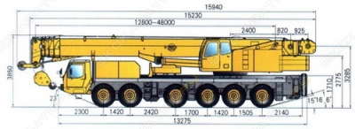 Габаритные размеры (Длина х Ширина х Высота), мм: 13980x2550x3610 Общий вес: 44000 кг Двигатель: HOWO Euro V Мощность двигателя: 268 кВт/1900 об/мин Номинальный крутящий момент двигателя: 1800/1400 Н.м/(об/мин) Максимальная скорость: 90 км/ч Коробка передач: 10-ступенчатая коробка передач Shaanxi Минимальный дорожный просвет: 305 мм Емкость топливного бака: 300 л Максимальная грузоподъемность: 70 т Максимальный грузовой момент: 2003 кН.м Длина основной стрелы: 11,6 м Длина полностью выдвинутой стрелы: 44,5 м Длина полностью выдвинутой стрелы+ гусек: 56,1 м Продольное расстояние выносных опор: 8,95 м Боковое расстояние выносных опор: 7,3 м Управление: джойстик с гидравлическим управлением Автономный подогреватель топлива кабины крановщика Кондиционер отопления и охлаждения кабины крановщика Сертификационный пакет EAC Под заказ. Стальные машины 8 лет на площадке