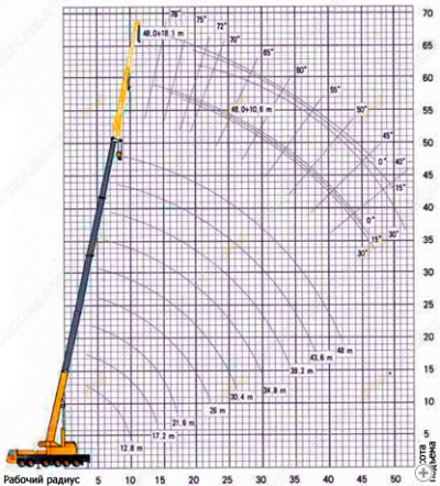 Длина стрелы: 80 м Габаритная длина, мм – 13980 Габаритная ширина, мм – 2550 Габаритная высота, мм – 3610 Общий вес, кг – 48000 Нагрузка на переднюю ось, кг – 8.3 2-я ось кг 8.3 3-я ось кг 15.7 4-я ось, кг – 15.7 Двигатель Модель двигателя — D10.38-50 Номинальная мощность двигателя, кВт/(об/мин) – 276/2000 Номинальный крутящий момент двигателя, Н.м/(об/мин) – 1560/1200-1500 Нормы выбросов - Евро V Ходовые параметры - Максимальная скорость, км/ч – 80 Минимальный дорожный просвет, мм – 305 Расход топлива на 100 километров, л – 40 Количество сидячих мест в кабине, шт. - 3 Емкость топливного бака, л – 300 Основные рабочие параметры Максимальная грузоподъемность, т – 80 Максимальный грузовой момент, кН.м – 3175 Длина основной стрелы, м – 12.4 Длина полностью выдвинутой стрелы, м – 48 Длина полностью выдвинутой стрелы+ гусек, м – 74.5 Угол наклона гуська, ° - 01530 Продольное расстояние выносных опор, м – 9.39 Боковое расстояние выносных опор, м – 7.9 Рабочая скорость Время подъема стрелы, s 55 Время полного развертывания стрелы, s 110 Максимум скорость вращения стрелы, об/мин 2.0 Стальные машины 8 лет на площадке