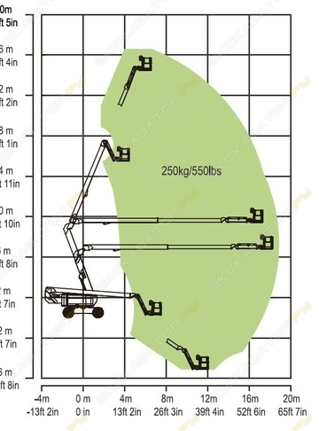 В наличии. Цена с НДС. Под заказ. Не требует вложений. Заводская гарантия. Склад запасных частей. Доставка по РФ. Готова к эксплуатации. Сервисная горячая линия. Полная документация.GTZZ-15J Коленчатый подъемникТехнические характеристики•РазмерыРабочая высота, максимальная, м - 16,6Высота платформы, максимальная, м - 14,6Горизонтальный вылет, максимальный, м - 8,5Просвет при подъеме и повороте, максимальный, м - 7,8Длина в сложенном состоянии, м - 7,7Ширина в сложенном состоянии, м - 2,28Высота в сложенном состоянии, м - 2,18Габариты платформы (Д/Ш), м - 1,53/0,76/1,1Колесная база, м - 2,03Дорожный просвет (центр), м - 0,25Перемещение - 4 ведущих (4WD) и 2и рулевое управление - управляемых (2WS) колесаВес, кг - 7800•ПроизводительностьГрузоподъемность, кг - 230Максимальное кол-во людей - 2 челСкорость движения в сложенном состоянии (max) - 5,1 км/чСкорость движения в поднятом состоянии (max) - 1,1 км/чПреодолеваемый уклон в сложенном состоянии - 40%Радиус поворота, внутренний (в слож./поднятом сост.), м - 2,47Радиус поворота, внешний (в слож./поднятом сост.), м - 5,18Рабочий уклон, максимальный - 5°Шины - 33*12-20•МощностьИсточник питания - Дизельный двигатель YANMAR 35 KWТопливный бак / Гидробак, л - 75/85Уровень шума - ‹82 дБАВстроенное зарядное устройство•КомпактностьБлагодаря компактной конструкции, высокой маневренности, точному управлению и мощному двигателю конструкция подходит для работы в ограниченном пространстве•360°Возможность вращения поворотной опоры на 360°•Аварийный спускСистема аварийной безопасности. Оператор может использовать аварийный предохранительный насос для безопасного спуска, если рабочая платформа заблокировалась на высоте•БезопасностьДополнительная система безопасности. Ножная педаль, джойстик управления работают только при нажатой педали•МобильностьСтрела может вертикально поворачиваться вверх и вниз на 135 градусов, а платформа - на 160 градусов•Удобный пультНаземный пульт управления оснащен дисплеем с большим экраном, самодиагностика без подключения к компьютеру•УстойчивостьАдаптивное выравнивающее устройство сработает автоматически, когда шасси столкнется с препятствием. Обеспечивает устойчивость оборудования на поверхности с уклоном до 5 градусов•Для работы на высотеКалитка рабочей платформы с самоблокирующимся замком обеспечивает дополнительную безопасность•ГрузоподъемностьБольшая стальная платформа, стандартная грузоподъемность до 250 кг SKYBOOM Россия