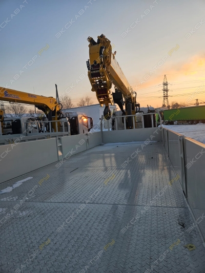КМУ KANGLIM KS-2056 на шасси FAW CA3250 6х4 + буровая навеска + сертифицированная корзина + платформа для перевозки морских контейнеровЦена указана с НДС.Бортовой автомобиль на базе шасси FAW CA3250 6х4 с крано-манипуляторной установкой за кабиной: KANGLIM KS-2056 (Корея, тросовая подвеска крюка, управление с сиденья оператора на колонне) (расчетная макс. г/п на вылете 2,0 м – 8000 кг; г/п на макс. вылете 20,3 м – 350 кг), дооснащение сертифицированной корзиной и буровой навеской.Усиленная стальная бортовая платформа, габаритные размеры ДхШхВ, мм: 6500x2550x600 с рифленым покрытием из стали 3 мм, оснащена твистлоками для крепления морского контейнера Технически допустимая нагрузка на бортовую платформу (при равномерном распределении груза) 20 000 кг.Технические характеристики шасси:Полная масса35 100 кгДвигательCA6DL2-39E5Макс. мощность (кВт/л.с.)не менее 390 л.с. / 2100 об/минМакс. крутящий момент1500 Н.м при1300-1500 об/минОбъем (л)8.6(L)Экологический классEURO 5ТНВДBOSCH CPN2.2-6DL2ФорсункиBOSCHCRIN2-6DL2КПП с КОМFAST,12JSD160TШины 315/80 R 22.5 Автоматический регулятор тормозовHaldexАнтиблокировочная тормозная системаWABCOУзел воздухоосушителя и клапаныWABCOКабина со спальным местомдаКондиционердаАвтомагнитоладаТопливный бак400 литровАнтикоррозийная обработка рамыдаЦвет кабинысинийМочевина40 л.Противооткатные брусьядаХарактеристики манипулятора KANGLIM KS-2056Максимальный грузовой момент, тм18Максимальная грузоподъёмность, кг8000Грузоподъёмность на максимальном вылете, кг350Максимальный вылет стрелы, м20,3Максимальная рабочая высота, м23,3Минимальный вылет стрелы, м2,0Угол наклона стрелы, град-17~80Угол поворота, град360Количество секций6Вылет передних аутригеров, м5,4Вылет задних аутригеров, м4,2Характеристики буровой навескиГлубина бурения (м)от 3 до 4,5Диаметр бурения (мм)360Максимальный радиус бурения7,1 мПриводГидравлическийДополнительное оборудование: сертифицированная корзина (гп 250 кг)Пульт дистанционного управления. Система ограничения работы двух пультов одновременно.Блок контроля опор, анемометр, датчик перегруза рабочей платформы, датчик транспортного положения стрелы, система аварийного опускания рабочей платформы. АвтоГОСТ 2 года на площадке