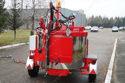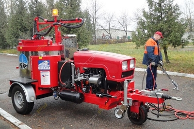 БПМ-500 — заливщик швов, предназначенный для разогрева и подачи под давлением битумно-эластомерных герметизирующих мастик при выполнении работ по герметизации трещин, швов гидроизоляции при ремонтно-строительных работах на автомобильных дорогах, аэродромных покрытиях, мостах, путепроводах. БПМ-500 является специальным тракторным полуприцепом. Основным элементом заливщика является разогреваемая емкость. Разогрев мастики до рабочей температуры происходит дизельной горелкой через масляную рубашку, заполненную термомаслом. Подача разогретой мастики осуществляется через подающий шланг и удочку. На заливщике устанавливается одноцилиндровый дизельный двигатель. Предусмотрена система электро-обогрева шланга подачи мастики и самого заливочного сопла удочки для постоянного поддержания рабочей температуры материала. Технические характеристики: Объем бака500 л Двигатель HYUNDAI –генератор, мощность кВт (л.с)Дизельный, 10 Компрессор HYUNDAI+ Метод нагреваДизельная горелка Ecoflam Италия Мощность нагревателя50 Кв Полная масса вес1300 кг Длина подающего шланга6 м Разогрев мастики через термомаслогорелкой на дизтопливе Рабочая температура120° -190°C Обслуживающий персонал2 чел. Объем топливного бака50 л Объем масляного бака30 л Разогрев мастики через термомаслоне более 2 ч ДвигательДизельный