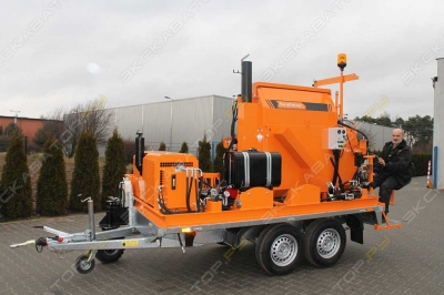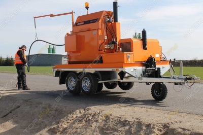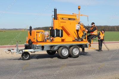 БПМ-500 — заливщик швов, предназначенный для разогрева и подачи под давлением битумно-эластомерных герметизирующих мастик при выполнении работ по герметизации трещин, швов гидроизоляции при ремонтно-строительных работах на автомобильных дорогах, аэродромных покрытиях, мостах, путепроводах. БПМ-500 является специальным тракторным полуприцепом. Основным элементом заливщика является разогреваемая емкость. Разогрев мастики до рабочей температуры происходит дизельной горелкой через масляную рубашку, заполненную термомаслом. Подача разогретой мастики осуществляется через подающий шланг и удочку. На заливщике устанавливается одноцилиндровый дизельный двигатель. Предусмотрена система электро-обогрева шланга подачи мастики и самого заливочного сопла удочки для постоянного поддержания рабочей температуры материала. Технические характеристики: Объем бака500 л Двигатель HYUNDAI –генератор, мощность кВт (л.с)Дизельный, 10 Компрессор HYUNDAI+ Метод нагреваДизельная горелка Ecoflam Италия Мощность нагревателя50 Кв Полная масса вес1300 кг Длина подающего шланга6 м Разогрев мастики через термомаслогорелкой на дизтопливе Рабочая температура120° -190°C Обслуживающий персонал2 чел. Объем топливного бака50 л Объем масляного бака30 л Разогрев мастики через термомаслоне более 2 ч ДвигательДизельный