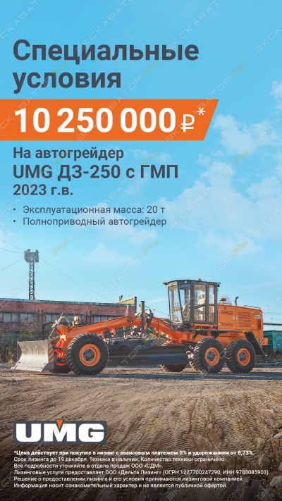 Автогрейдер UMG ДЗ-98 — мощный и проходимый автогрейдер для сложных условий эксплуатации. 235 л.с., тяговое усилие 140 кН, отвал 4,1 м с выносом 900 мм. Полноповоротный отвал, мощный двигатель ЯМЗ-238НД3 и усиленная ходовая часть выдержат даже самые тяжёлые задачи на трассах, в лесу и на промышленных площадках. Предпусковой подогреватель, FOPS/ROPS, проблесковый маяк и надёжная гидравлика — всё для безопасной и продуктивной работы. Топливный бак на 345 л обеспечивает длительную смену без дозаправки. Отличный выбор для дорожных служб и подрядчиков, работающих в регионах с суровым климатом. Прост в обслуживании, ремонтопригоден, запчасти доступны. Готов к поставке под госконтракты. Цена действует при покупке в лизинг с авансовым платежом 0% и удорожанием 8,7% Срок лизинга до 19 декабря. Техника в наличии. Количество техники ограничено. Лизинговые условия предоставляет ООО "Дельта Лизинг" (оргн1227700, ин) Решение о предоставлении лизинга и его условия принимаются лизинговой компанией Вся информация о стоимости и в описании данного товара носит исключительно ознакомительный характер и не является публичной офертой. За более точной информацией обращайтесь по телефону представленному в объявлении или на официальном сайте компании ООО "СДМ" UMG 4 года на площадке