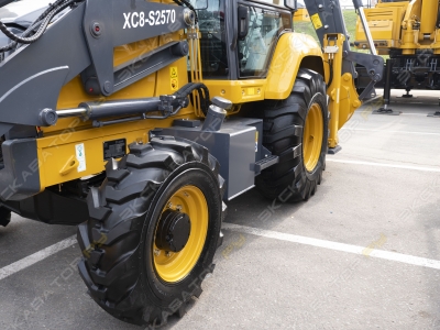 Машина оснащается фронтальным челюстным ковшом объёмом 1,1 куб. м. Просторная кабина с защитой ROPS/FOPS и интуитивно понятным управлением снижает нагрузку на оператора при длительных сменах.