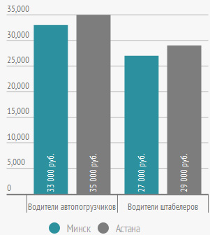 В целом по России средняя зарплата водителей автопогрузчиков составила 29 тыс. рос. рублей, водителей штабелеров - 34 тыс. рос. рублей. В столицах соседних государств, напротив, более востребованными оказались первые - в месяцам им предлагалось 33 тыс. (Минск) и 35 тыс. (Астана).