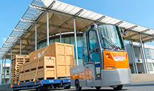 Опционально тягач может быть оснащен программой управления в пешеходном режиме. Боковая замена акумуляторной батареи легко осуществляется с помощью стенда и низкоподъемной тележки.