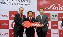 Для торжественного празднования сборки и выпуска 50000-ной модели погрузчика собрались все сотрудники компании Linde. Символический ключ был вручен заказчику, Fuyao Group