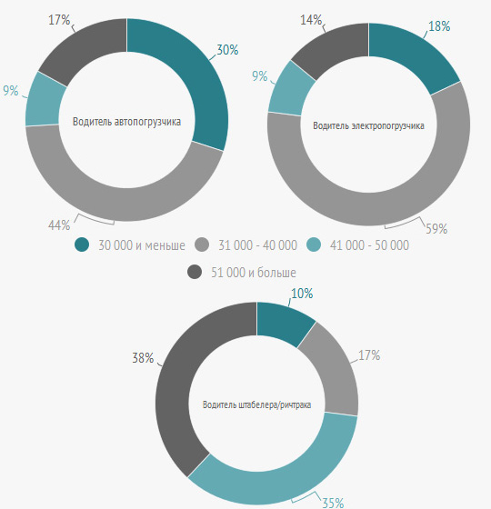Традиционно в Москве и Московской области соискателям предлагалась более высокая оплата. В основном оклад водителей авто- и электропогрузчиков в столице находится в пределах от 31 000 до 40 000 российских рублей (44% и 59% из общего числа объявлений соответственно), в регионах страны - 30 000 и менее (70% и 65% соответственно). Для водителей штабелеров в большинстве случаев (73%) зарплата предлагалась от 41 000 и более в Москве, а 30 000 и меньше - в регионах.