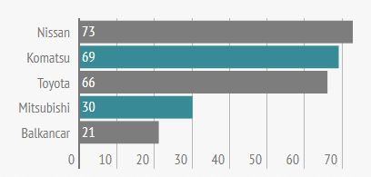 В сегменте подержанных вилочных погрузчиков также произошли изменения: февральский лидер Toyota переместился на третье место рейтинга, уступив его бренду Nissan, занимавшему до этого вторую строчку. На смену Doosan, выбывшему на этот раз из ТОПа, в рассматриваемый период пришли автопогрузчики производства Balkancar.